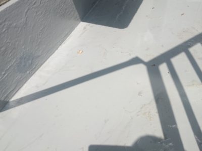 陸屋根防水工事、既存防水層撤去、旧塗膜、接着剤剥離作業、下地調整、改修用ドレン設置、ウレタン塗膜防水、トップコート塗布、手すり鉄部塗装 | |||||