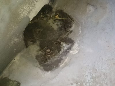 入隅部ドレン周り含め防水層の剥がれ、防水層自体の寿命もありますが、改修時の下地調整、特に立上りと平場の取り合い部分に不具合が見受けられました。主たる雨水の浸水はここからと予想します。元々平場はガラスブロックが施工されているため、防水層が切れた途端に漏水に直結するものと思われます。
