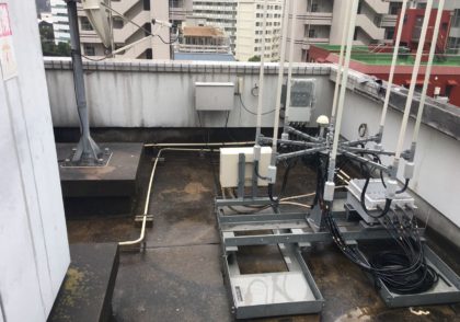 屋上ルーフバルコニーの防水工事で設備機器やアンテナや機械類が多くある屋上でした