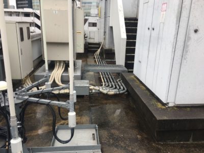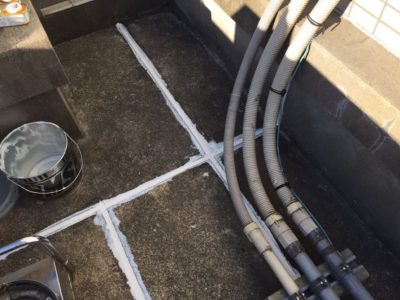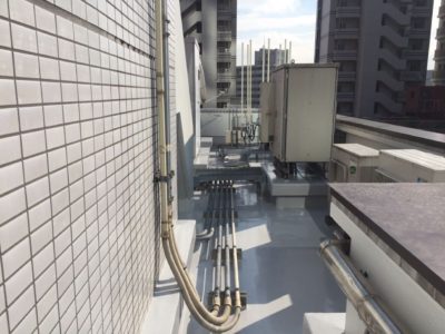 屋上ルーフバルコニーの防水工事で設備機器やアンテナや機械類が多くある屋上でした