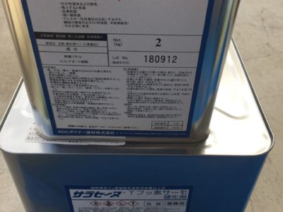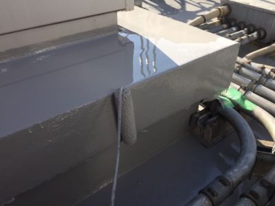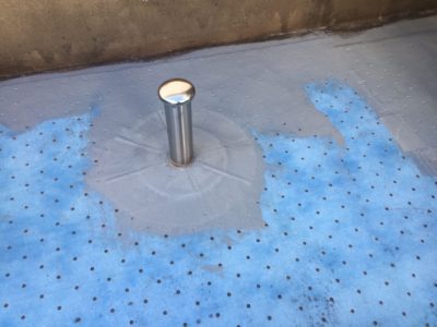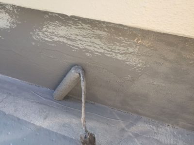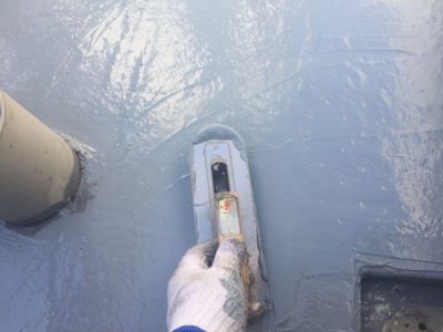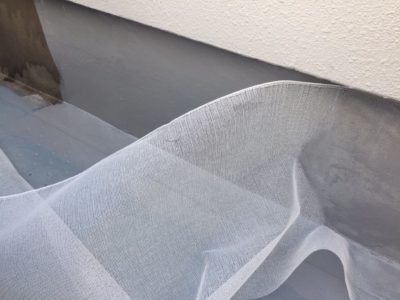 今回の防水仕様は、AGCポリマー建材のサラセーヌ通気緩衝AV工法の遮熱フッ素トップコートとしました。AV工法は通気性はもちろんですが、下地との密着性が長持ちするので、10年後のメンテナンスで脆弱部補修の上にウレタン主材+トップコート塗りでメンテナンス完了するので、長期的な考えるとコスパの良いウレタン防水になります。