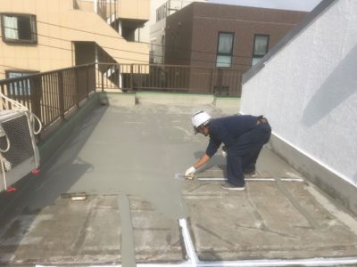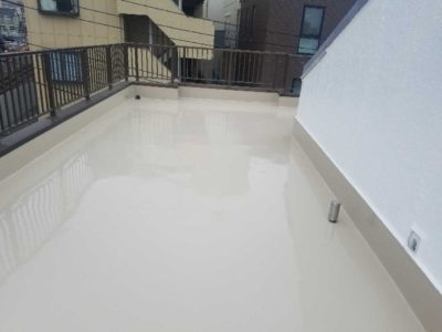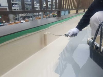 不陸凹凸なく均一にローラー塗りとします。 材料は平場用のレベリングタイプを使用しますが平滑に均すことが大切になります。