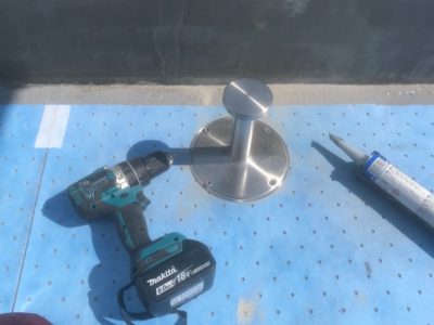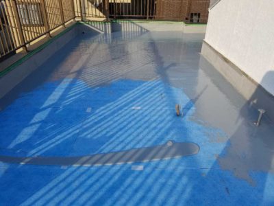 防水材料はAGCポリマー建材のサラセーヌです。 工法はウレタン防水通気緩衝AV工法です。 AV工法は穴の空いたフェルトシートを敷いた上にウレタン防水を塗る工法で通気性、ふくれ対抵抗、動きに対する抵抗性、耐風圧性にとても優れています