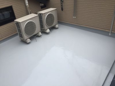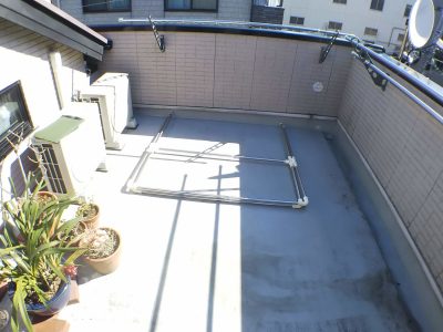 ルーフバルコニーのウレタン防水層は部分的な黒ずみと水たまりの跡があります。