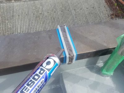 アルミ笠木目地の周りにバックアップ材で型を作り、その中にシールを打ちます。