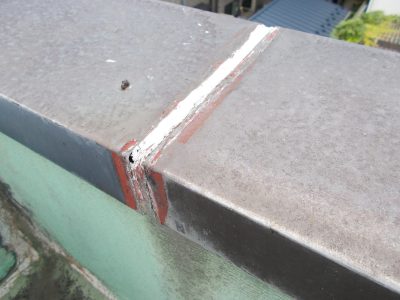 アルミ笠木のジョイント部の目地にも隙間が発生してるでシールを打って防水処理が必要になります。