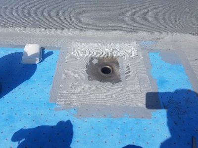 改修用ドレンは既存ドレンの形状になじませて速乾性のシーリンクで接着設置し立上りのつなぎ目に補強クロスを貼ります。