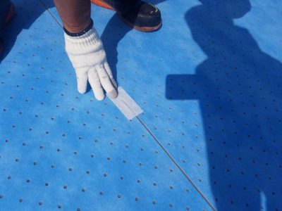通気シートは下地の湿気を通気する機能と下地が動いてクラックなどな発生した場合の緩衝効果があります。