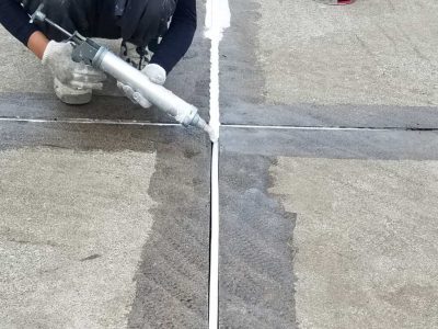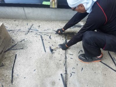 塔屋のスラブコンクリート面のクラックシーリングをすることで防水層にクラックの動きの影響を与えないようにします。