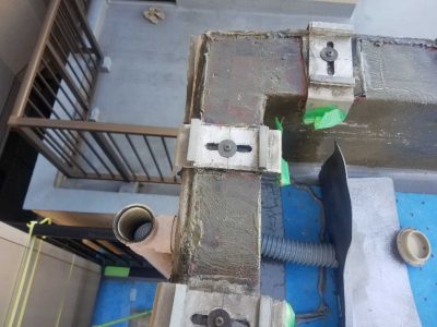 改修用ドレンは既存ドレンの形状になじませて速乾性のシーリンクで接着設置し立上りのつなぎ目に補強クロスを貼ります。