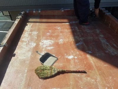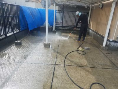 防水面は平面なので汚れが付着しやすく、完全に汚れを除去してから防雨水を行うことは防水材の密着性を高めるために不可欠な作業です。 防水施工を行う上で大切な工程の1つが高圧洗浄です。