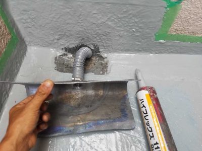 改修用ドレンは既存ドレンの形状になじませて速乾性のシーリンクで接着設置し立上りのつなぎ目に補強クロスを貼ります。