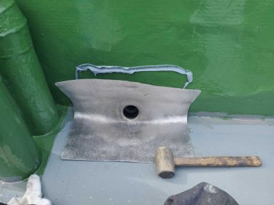 改修用ドレンの鉛プレート周囲を補強クロス貼りをしてシーリングを打って平滑に均し補強をします。