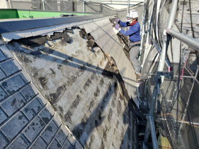 斜壁のアスファルトシングルも同様に劣化し部分的に膨らんでいる部分があります。