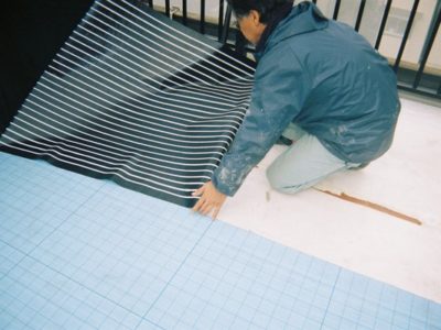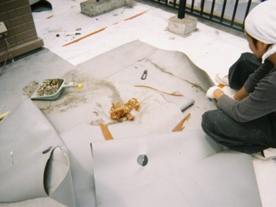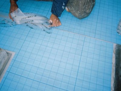 通気緩衝用のシートを貼っていきます。このシートの上にウレタン防水を施すことによって下地の湿気などによるフクレを防ぎ防水が長持ちします