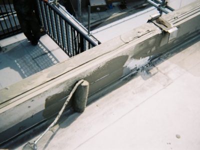 手摺の基礎、立上りは密着工法で防水処理します。まずプライマーを塗ります。