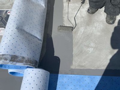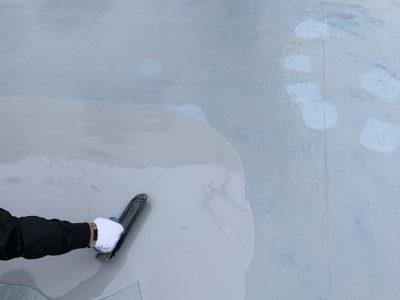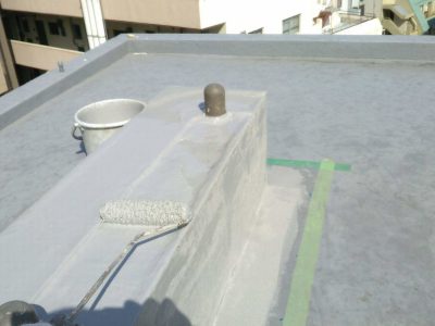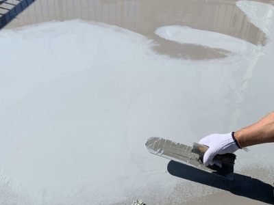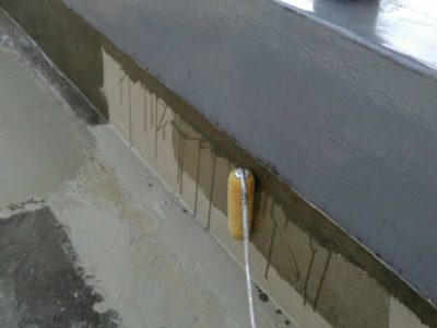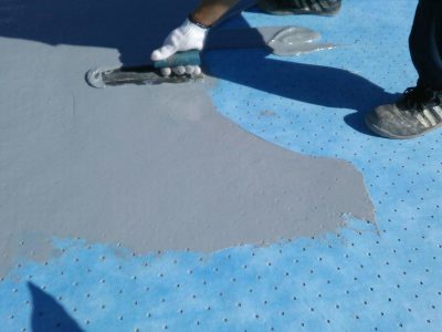 不陸凹凸なく均一にローラーやコテ塗りとします。 材料は平場用のレベリングタイプを立上りには専用材を使用しますが平滑に均すことが大切になります。