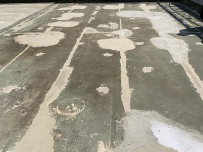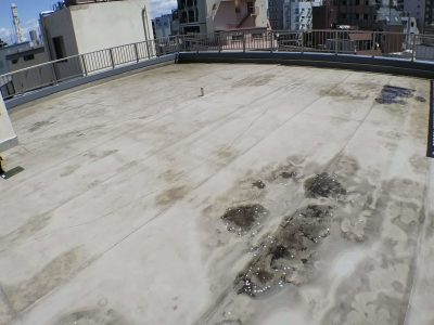 既存のシート防水表面が黒ずんで水たまりがあり全体的に劣化しています。