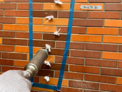 タイル面にクラックが発生している部分には透明のエポキシ樹脂のダイレクト注入を行います。