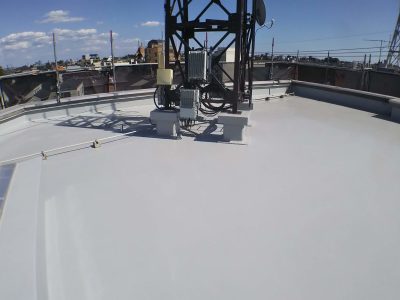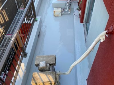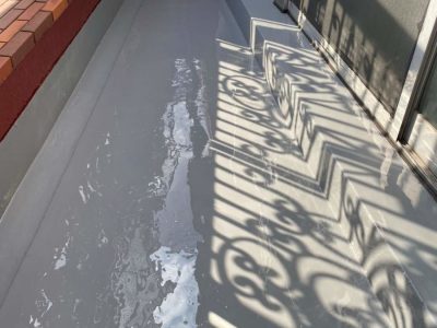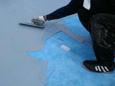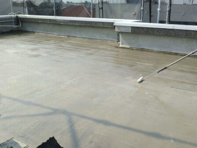 水溜まりが出来ないよう下地を整え、防水層の密着性を高めるプライマーを塗ります。