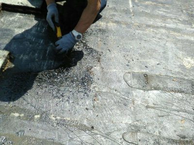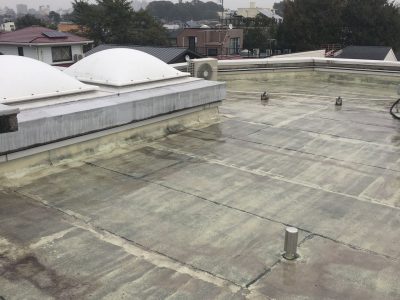 防水層の状態から判断すると何度も重ね貼り(オーバーレイ工法)にて防水改修を繰り返しているように見えます。 今回の防水改修では全てを撤去して新たに防水改修をする必要があります。
