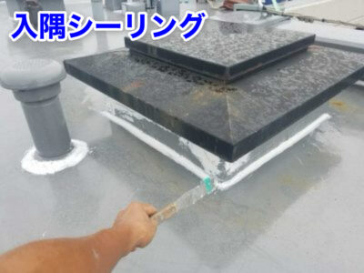 入隅にシールを打ち、新規防水層の密着性を上がるためプライマーを塗ります。