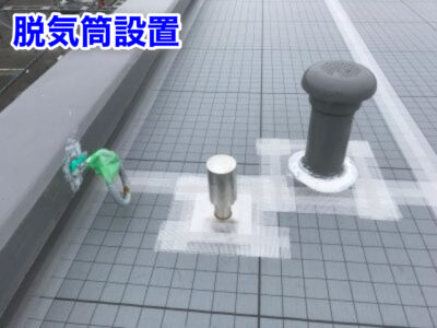 改修ドレンを交換し、脱気筒を設置し補強クロステープを貼って継ぎ目を補強します。