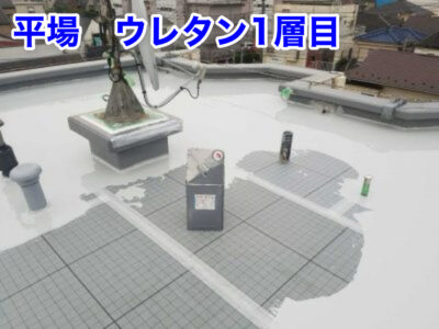 立上りを塗ったら、屋上全体に2層目のウレタン防水主材を塗ります。ウレタン防水主材は2回重ねで規定塗布量を塗ります。