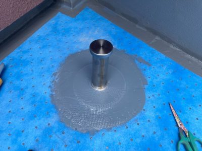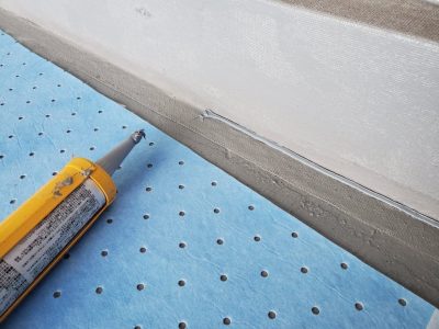 入隅シーリングを打つことで下地コンクリート構造が違うために発生する動きを防水層に直接影響を与えない緩衝効果があり防水層が切れることを防ぎます。