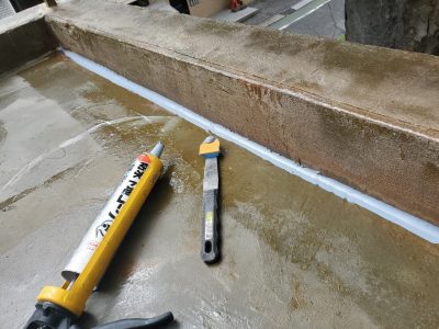 入隅シーリングを打つことで下地コンクリート構造が違うために発生する動きを防水層に直接影響を与えない緩衝効果があり防水層が切れることを防ぎます。