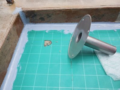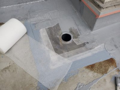 改修用ドレンは既存ドレンの形状になじませて速乾性のシーリンクで接着設置し立上りのつなぎ目に補強クロスを貼ります。