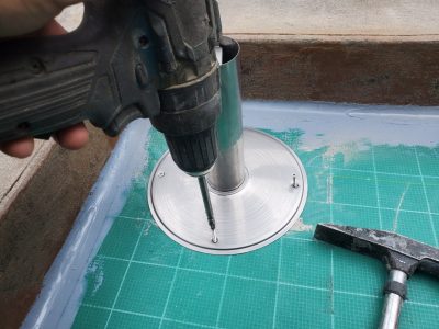 脱気筒は通気緩衝工法に設置する通気装置でステンレス製のプレート+筒状掲揚となっています。
