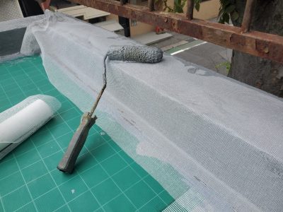不陸凹凸なく均一にローラー塗りとします。 材料は平場用のレベリングタイプを使用しますが平滑に均すことが大切になります。