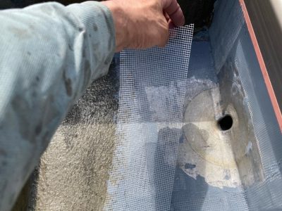 改修用ドレンの鉛プレート周囲を補強クロス貼りをしてシーリングを打って平滑に均し補強をします。