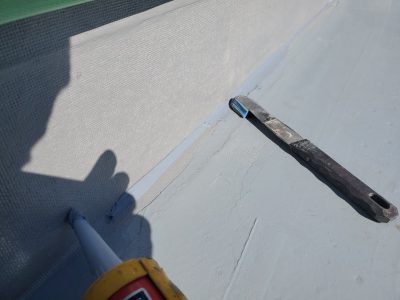 入隅シーリングを打つことで下地コンクリート構造が違うために発生する動きを防水層に直接影響を与えない緩衝効果があり防水層が切れることを防ぎます。