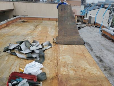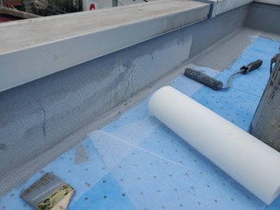 仮に接着していように見えるシート防水上に新たな防水を塗っても下地のシート防水が浮いたり剥がれたししたら新たな防水層も一緒にダメになります。 その後は、カチオンモルタルで平場と立上りの表面の凹凸を平らにします。カチオン系樹脂モルタルは、カチオン系エマルションを配合したセメント系の下地調整材です。 カチオン系樹脂モルタルは、優れた接着力で、様々な下地に強力に接着し、安定した下地を形成します。 傷んだ下地を補修する材料として下地処理材に使います