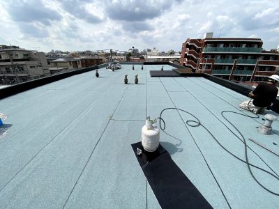 屋上は、新規アスファルトシートをその裏面とアスファルト活性剤が塗ってある下地をガスバーナーで熔かすように炙って張ります。