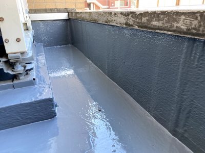 新規防水施工では平場、立上り共にウレタン防水塗膜を塗るため、平場は脆弱部補修、立上りはシート防水を全て撤去して施工します。