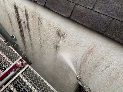 雨染みが見受けられるため、バイオ高圧洗浄でしっかり汚れを落として塗装します。