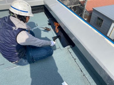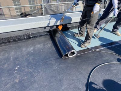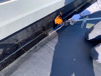 新規アスファルトシートをその裏面とアスファルト活性剤が塗ってある下地をガスバーナーで熔かすように炙って張ります。