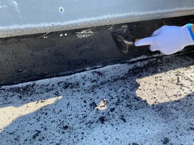 平場は既存のアルファルト露出防水層の上にアスファルトプライマーを塗ります。