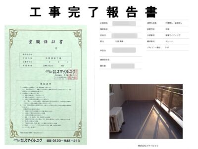 お引渡しの後に工事完了報告書と工事保証書を提出させて頂きます。