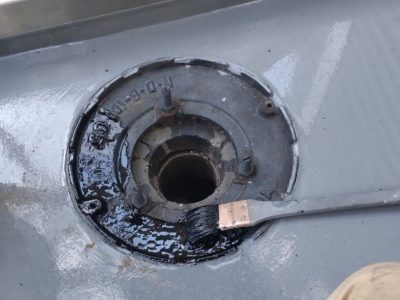 伸縮目地内のスポンジと塩ビカバーを撤去して溝内にバックアップ材を挿入します。