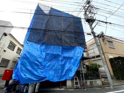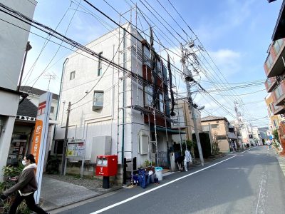 1面のみの足場架設となり道路側に倒れないようしっかりと補強繋ぎをとりました。