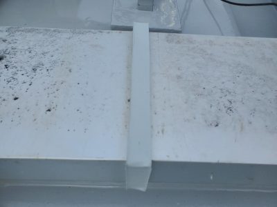 ドリルで穴あけとすると内部に入ってしまった雨水が勢い良くでます。全ての雨水が抜け出たらグラウト材を内部に注入し支柱内の防水処理をします。