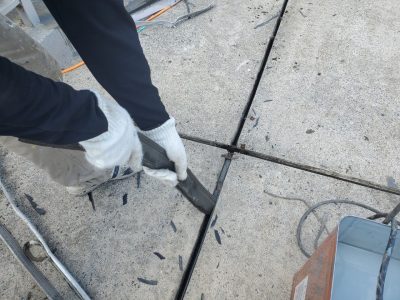 伸縮目地内のスポンジと塩ビカバーを撤去して溝内にバックアップ材を挿入します。