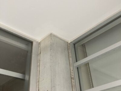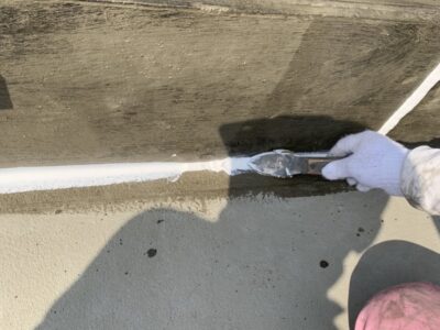 入隅シールを打つ目的は平場下地と立上り下地を緩衝する役割もあります。 また、ウレタン防水層の厚みも均一に保つ施工がしやすくなります。