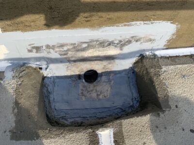 ヨコ向き改修用ドレンは既存ドレンの形状になじませて速乾性のシーリンクで接着設置し立上りのつなぎ目にシーリングを打って平滑に均します。
