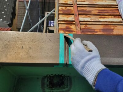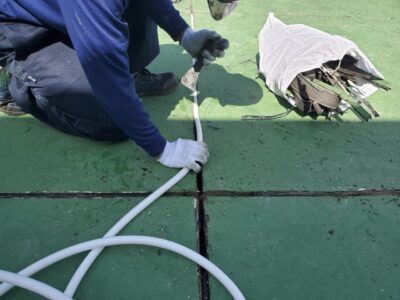 ※伸縮目地撤去シール処理は、新規防水層が下地の保護コンクリートの動きにより切れることを防ぐ作業です。