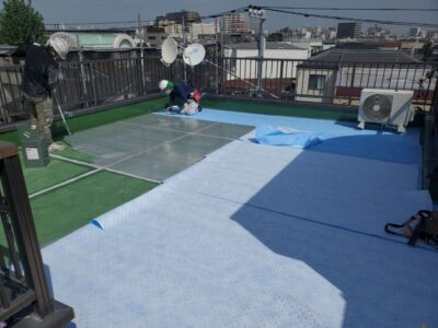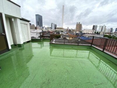ウレタン塗膜防水 通気緩衝工法 屋上・塔屋:遮熱フッ素トップコート / バルコニー:フッ素トップコート 塔屋防水工事 屋上防水工事 3階バルコニー防水工事 豊島区上池袋K様